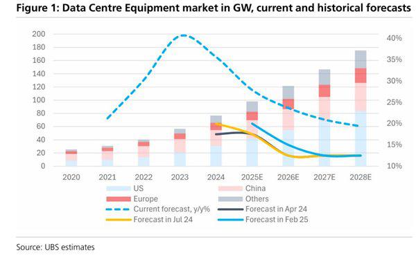 正是这种“算力换性能 + 加速迭代”的双重效应,使得算力产业发展频频超预期。12 月 5 日,瑞银发布的最新深度报告显示,北美、欧洲和亚太地区的数据中心空置率持续处于历史低位(分别为 1.8%、3.6% 和 5.8%),显示出供不应求的市场格局。基于强劲的在建项目数据及极低的空置率,瑞银宣布上调该行业的中期增长预期,预计 2026 年包括电力、制冷及 IT 设备在内的市场增速将达到 20-25%。