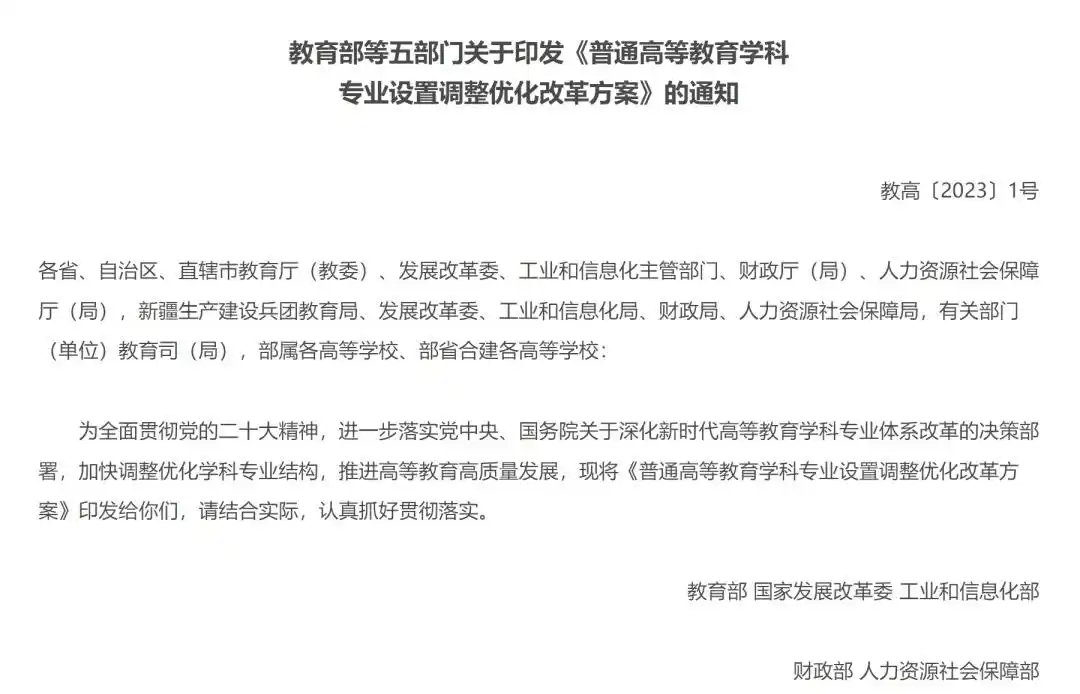 2023年2月21日,教育部等五部门联合印发了《普通高等教育学科专业设置调整优化改革方案》,其指导思想是要贯彻新发展理念,面向世界科技前沿、经济主战场、国家重大需求和人民生命健康,推动高校适应经济社会发展需要,深化学科专业供给侧改革,提高人才自主培养质量,建设高质量高等教育体系。确定的工作目标是:到2025年,优化调整高校20%左右学科专业布点,新设一批适应新技术、新产业、新业态、新模式的学科专业,淘汰不适应经济社会发展的学科专业。由此可见,文理科都面临优化改革的任务。